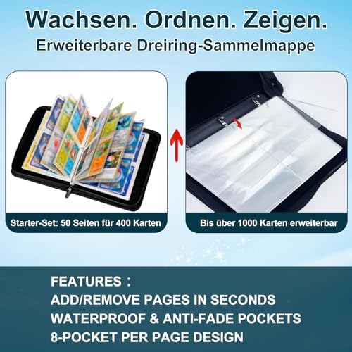 RINGS & REMOVABLE PAGES MECHANISM: The 3 flexible metal ring system allows you to add or remove pages in seconds. Easily customize and expand your collection beyond 400 cards with compatible pages (like Vault X). Perfect for collections that grow!