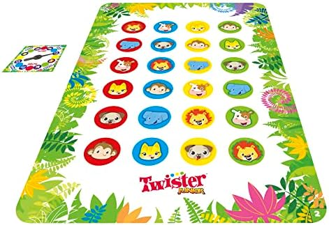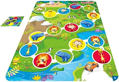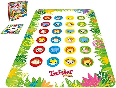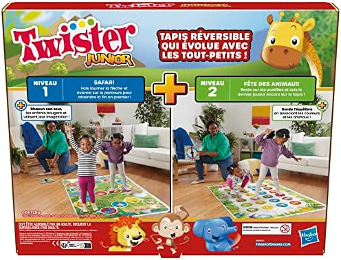 Les tout-petits vont bien s’amuser avec le jeu Twister Junior, une aventure avec thème de safari qui évolue avec eux ! Ce jeu amusant pour enfants à partir de 3 ans procure 2 niveaux de jeu grâce à son tapis et à sa roulette réversibles. Au niveau 1, avec le côté Safari du tapis, les enfants font tourner la roulette pour se déplacer sur le parcours du safari. À chaque tour, les enfants ont l’occasion de découvrir les couleurs et d’imiter les sons et les mouvements d’un animal. On retourne le tapis pour passer au niveau 2, la Fête des animaux. On fait tourner la roulette pour voir sur quelle couleur et quel animal il faut placer son pied ou sa main. Le dernier joueur en jeu l’emporte ! Pour 2 à 4 joueurs, ce jeu Twister Junior est amusant pour toute la famille et parfait pour faire bouger les enfants à l’intérieur. Twister et toutes les marques associées sont des marques de commerce de Hasbro.