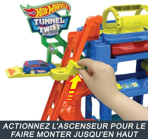 Le Tunnel de Lavage Hot Wheels City ajoute une touche d’innovation au processus de changement de couleur avec un tunnel de pulvérisation d’eau ! Les enfants conduisent la voiture Hot Wheels Color Shifters jusqu’à l’entrée et font monter l’ascenseur au dernier étage. Faites avancer le véhicule dans le tunnel de lavage rotatif. Il est arrosé d’eau très chaude et sa carrosserie change instantanément ! Passez dans le rouleau en mousse et utilisez l’aspirateur pour parfaire le travail. Enfin, plongez dans la cuve d’eau glacée. La voiture reprend ses couleurs d’origine. Répétez le processus à volonté. Les couleurs et les décorations peuvent varier.