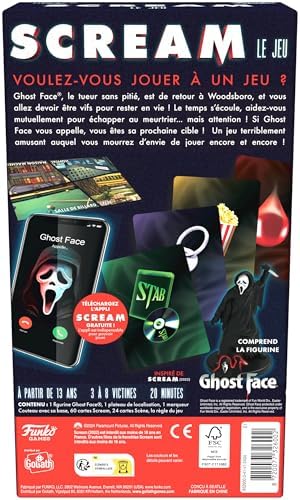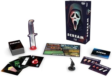 Plongez dans l’univers terrifiant de Scream avec le jeu de société coopératif « SCREAM LE JEU » de FUNKO Games. Conçu pour les adultes et les joueurs enfants dès 13 ans, ce jeu promet des heures d’excitation et de frissons en compagnie de Ghost Face®. Affrontez Ghost Face® dans ce jeu coopératif intense qui se déroule en temps réel. Rassemblez vos amis et collaborez tous ensemble pour remplir vos objectifs et échapper au meurtrier. Chaque seconde compte dans cette course effrénée pour la survie. Plongez dans l’horreur avec la figurine de Ghost Face® qui se déplace sur le plateau de jeu, vous traquant à chaque coin. L’immersion est totale pour les fans de la saga Scream, qui retrouveront avec plaisir l’atmosphère angoissante de Woodsboro. L’expérience est enrichie par l’application de jeu, qui ajoute une narration captivante et une musique immersive. Personnalisez votre partie en ajoutant les prénoms et les photos des joueurs, mais attention aux appels sinistres de Ghost Face®. Le design terrifiant du jeu, inspiré de l’univers de Scream, et le marqueur 1er joueur en forme de couteau ajoutent une touche d’authenticité à l’expérience. Plongez-vous dans l’atmosphère oppressante de ce jeu de société immersif. « SCREAM LE JEU » convient à 3 à 8 participants et dure environ 20 minutes par partie. Chaque joueur doit coopérer pour atteindre les objectifs et échapper à Ghost Face®. Préparez-vous à vivre des moments palpitants et pleins de suspense dans ce jeu où chaque choix peut être vital.