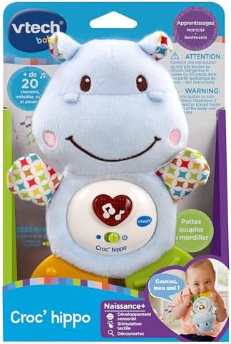 Bébé découvre un copain tout doux à câliner en musique. Avec différentes textures pour stimuler ses sens : corps en peluche et pattes arrière en plastique souple. Un bouton cœur lumineux pour déclencher de douces phrases, chansons et des mélodies. Le cœur clignote au rythme de la musique. Deux pattes souples à mordiller pour soulager les gencives et apaiser les poussées dentaires de bébé. 3 chansons et 10 mélodies. Module électronique détachable (lavage en surface uniquement). arrêt automatique. Boîte Try-me.