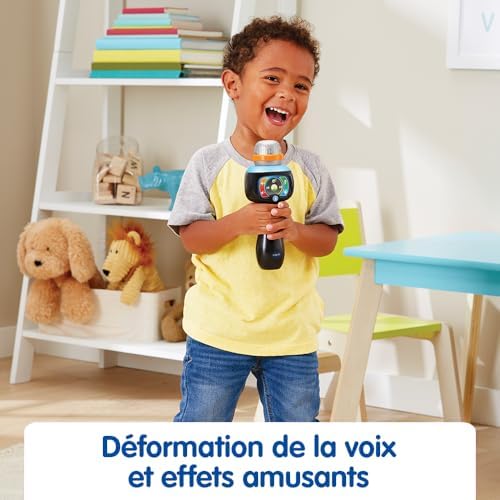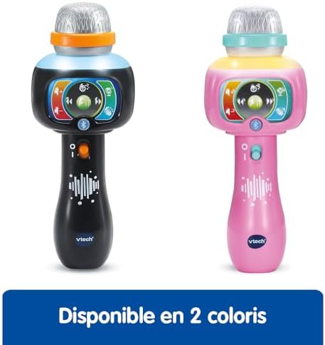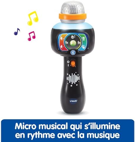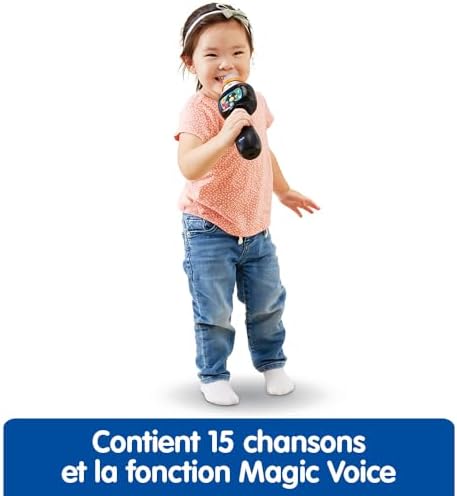 Le Super micro magic’fun est un micro karaoké sans fil, dédié aux enfants, garçons et filles, à partir de 2 ans, pour leurs permettre de briller sous les projecteurs comme leurs idoles ! En attrapant le micro dans sa main, votre enfant peut chanter et s’amuser à transformer sa voix sur les comptines intégrées dans ce jouet musical. Dès qu’il se sent prêt, il peut effacer la voix de l’interprète en appuyant sur le bouton Magic Voice, et chanter tout seul comme un grand ! Il rayonne alors à son tour sous un tonnerre d’applaudissements ! En connectant un lecteur MP3 (non inclus) en Bluetooth®, il peut aussi chanter sur ses chansons préférées ! Cette connexion est codée pour la rendre sécurisée. Le microphone enfant s’illumine et change de couleur au rythme de la musique ou de la voix. Votre enfant transforme son concert en comédie lorsqu’il utilise les 5 effets rigolos qui modifient sa voix (voix grave, voix aiguë, robot, écho de voix, et alien) ! 15 chansons et comptines. Existe aussi en rose. Réglage du volume sonore et arrêt automatique du jouet pour préserver la durée de vie des piles. Fonctionne avec 3 piles LR03-AAA incluses. Cadeau enfant idéal dès 2 ans, pour garçon et fille.