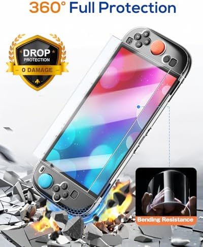 Protective case & HD screen protector: Made of transparent polycarbonate (PC), the switch 2 case reduces yellowing and dust accumulation (compared to TPU/silicone). Combined with two 9H tempered glass screen protectors, it provides scratch resistance while preserving the original touch sensitivity and visual clarity. (The protective case and screen films ONLY compatible with Switch Gen 2)