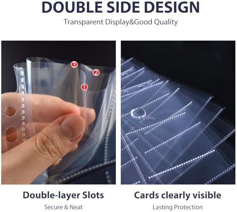 Top loading pockets: Top-loading makes it easy to insert cards, prevent cards from falling out, ideal for storing and displaying cards, 11 pre-drilled holes fit the card binder compatible with Pokémon/standard 3-ring binder.
