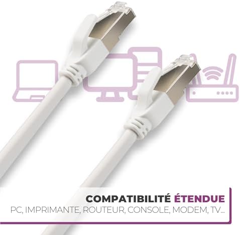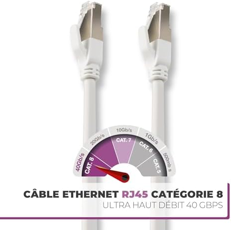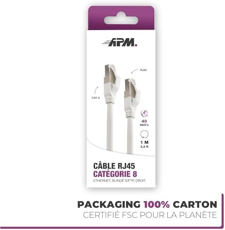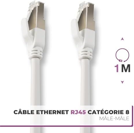 Connect your peripherals with this RJ45 cable that allows data transmission at optimal speed! Technical features: RJ45 cable Male/Male – Category 8 – Shielded F/FTP – Maximum throughput: 40Gb/s – Shielded – AWG : 26 – PVC jacket – Cable colour: white – Cable length: 1 m. Practical information: Packaging: closed box made of FSC cardboard. PCB: 6. Warranty: 10 years. Connect your peripherals by RJ45. RJ45 Straight F/FTP Cable Max Speed: 40Gbps – Category 8 – Colour: White