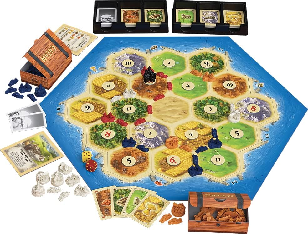 CONTENU DU JEU : 19 tuiles Terrain (8 x 8 cm), 6 pièces de cadre avec 9 ports, 95 cartes Ressource, 25 cartes Développement, 4 fiches Coûts de construction, 2 fiches spéciales, 2 compartiments pour ranger les cartes, 16 figurines Ville (2.5 x 2.5 cm), 20 figurines Colonie, 60 figurines Route, 1 figurine Voleur, 18 jetons numérotés, 2 dés, 1 résumé introductif des règles du jeu, 1 règle du jeu, 1 glossaire.