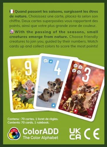 Traversez les saisons à la rencontre d’êtres surgis d’une fleur ou abrités au creux des arbres. À chaque tour, des cartes sont révélées, choisissez-en une, mais attention à celles que vous laissez aux autres ! Placez-la dans l’un des 9 emplacements de votre aire de jeu selon son chiffre. Les cartes placées l’une sur l’autre sont validées et rapportent des points en fin de manche ainsi que votre plus grande zone de couleur et vos spirales. À l’issue des 3 manches, soyez le joueur possédant le plus de points pour gagner la partie. Simple et redoutable ! Un nouveau jeu dans la gamme de Sea Salt & Paper. Facile à jouer et qui donne envie de rejouer, illustré de photos de créatures sculptées très originales.