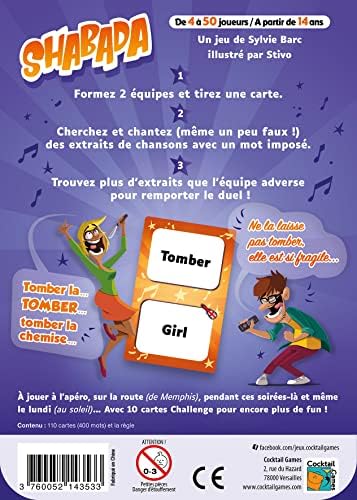 EXPÉRIENCE INTERACTIVE : Shabada contient 100 cartes (soit 400 mots) + 10 cartes Challenge. Des dizaines d’heures de chansons en perspective. Mettez à l’épreuve votre mémoire musicale et votre créativité. Les défis variés stimulent la participation de tous, créant ainsi une expérience interactive et dynamique.