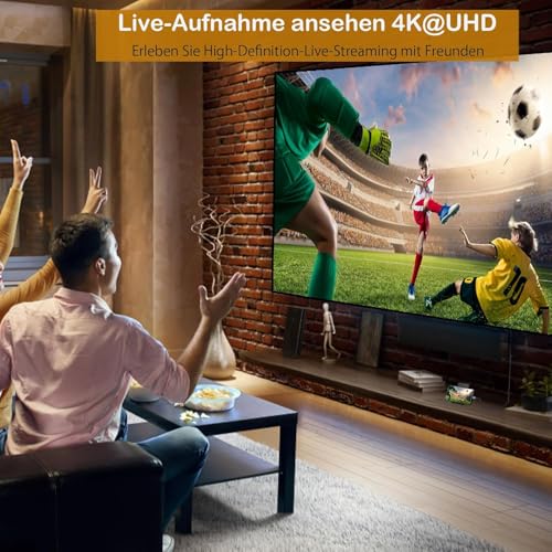 Grand téléviseur diffusant un match de football en haute définition. Personne assise sur le canapé, faisant des gestes avec enthousiasme. Superposition de texte : « Live-Aufnahme ansehen 4K @UHD » (Afficher l'enregistrement en direct 4K @UHDGrand téléviseur diffusant un match de football en haute définition. Personne assise sur le canapé, faisant des gestes avec enthousiasme. Superposition de texte : « Live-Aufnahme ansehen 4K @UHD » (Afficher l'enregistrement en direct 4K @UHD