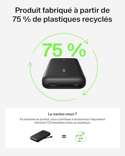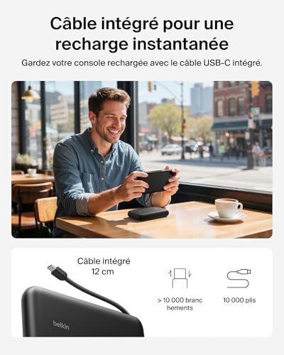 « Thanks to its built-in USB-C cable, this 30W power bank allows you to charge 3 devices at the same time. It offers up to 3 full reloads of your console. * Contains 20000mAh internal battery. Charging capacity is lower and may vary depending on certain conditions. The maximum charging capacity was calculated by comparing the maximum autonomy capacity of the Nintendo Switch 2 with the autonomy capacity of this external battery. The actual result may vary depending on a number of factors and depending on the user. ** Belkin has sold over 1 billion products worldwide since 2000. *** The actual percentage of recycled plastic of each component may vary. The total recycled plastic content is 42.9% (excluding cables). Belkin is the leading accessory brand offering high quality and innovative solutions for over 40 years. Specifications: Capacity: 20000mAh USB-C cable, USB-C port and USB-A port USB-C cable/port (input): 30W max. USB-C Cable/Port (Output): 30W Max USB-A: 12W max. Total power: 30W max. Dimensions: 154mm x 76.2mm x 25.1mm Built-in cable length: 15cm Charging indicator Compatibility: Nintendo Switch 2, Nintendo Switch, Apple iPhone 16 Pro Max, iPhone 16 Pro, iPhone 16 Plus, iPhone 16 Plus, iPhone 16, iPhone 15 (all models), iPhone 14 (all models), iPhone 13 (all models), iPhone 13 (all models). them), Samsung Galaxy S2 22 (All models), Galaxy S23 (All models), Galaxy S24 (All models), Galaxy S25, Galaxy S25+, Galaxy S25 Ultra, iPad Pro 12.9″ (5th Gen. ), iPad Pro 11 » (3rd Gen) ), iPad Air (5th Gen). ), iPad (10th Gen). ), iPad Mini (6th Gen) ), etc. USB-C cable with Lightning connector (sold separately) required to charge your iPhone 13 or iPhone 14 (all models) Product made from post-consumer recycled plastic materials and plastic free packaging