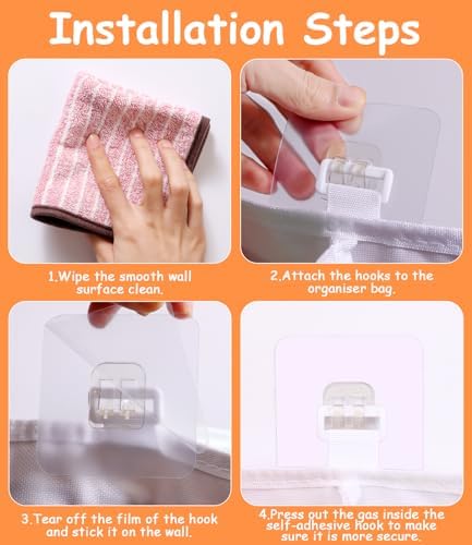INSTALLATION DES CROCHETS: Sac est livré avec 4 crochets auto-adhésifs solides, assurez-vous que le mur est propre et sec, déchirez le ruban adhésif des crochets autocollants, pressez-les sur le mur, puis accrochez le sac de rangement pour jouets de bain