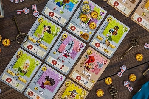 🎯 VOTRE OBJECTIF : Construisez un tableau gagnant en recrutant la meilleure combinaison de 9 cartes personnages. Pour ce faire, gérez bien votre or, vos clés et le placement de vos cartes, tout en utilisant au mieux les effets de vos recrues !