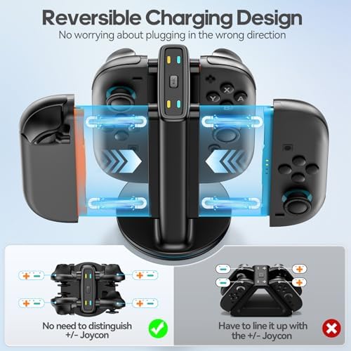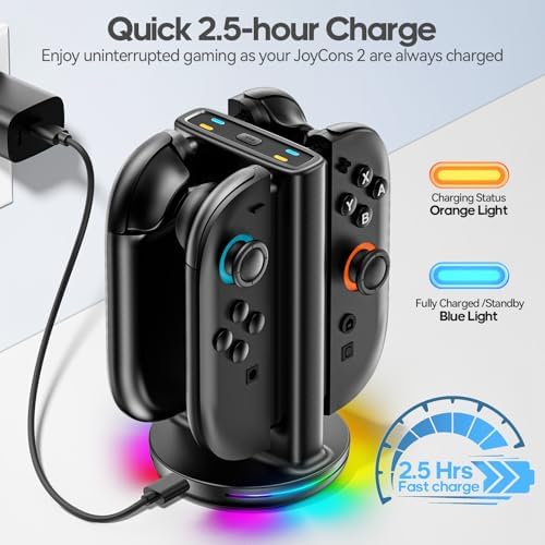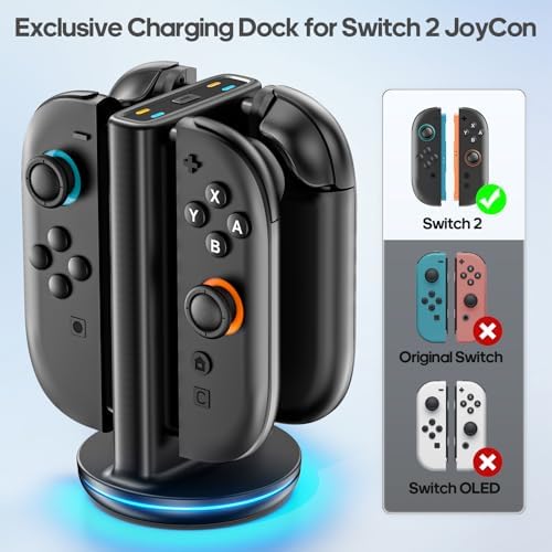 HIGH-LEVEL SAFETY INSURANCE: Built-in smart chip provides comprehensive security protection. It automatically detects the charging status of each Joy Con and stops charging once they are fully powered, effectively preventing overcharging, overheating and potential damage. Exclusively compatible with the 2025 release of Nintendo Switch 2 Joy Con (controllers not included), you can charge with peace of mind, knowing that your valuable gaming accessories are protected.