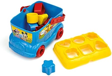 Composé de 6 trous à formes, de 9 pièces colorés Disney Baby à encastrer, d’une poignée de transport et de 4 roues pour jouer avec le bus