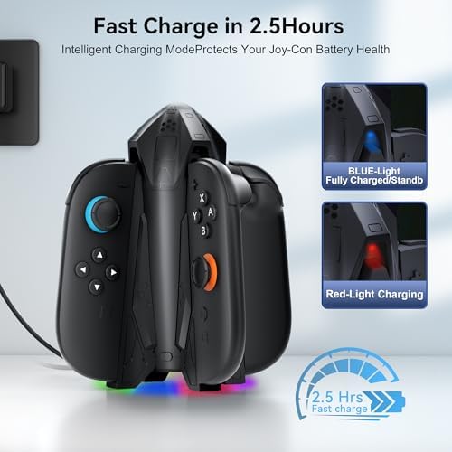Features: This Joy-Con charger will beautify your room and organize your play space. It can charge 4 Joy-Con simultaneously and fully charges in 2.5 hours, which is 1.4 times faster than previous chargers. Its smart chip protects the battery. Thanks to its magnetic adsorption design, it can be inserted in any direction and displays the charging status through seven ambient lighting colors. It can be charged even with a protective case and its use is simple. Lightweight and compact, made of ABS, it is safe and durable, easy to carry and ideal as a gift.