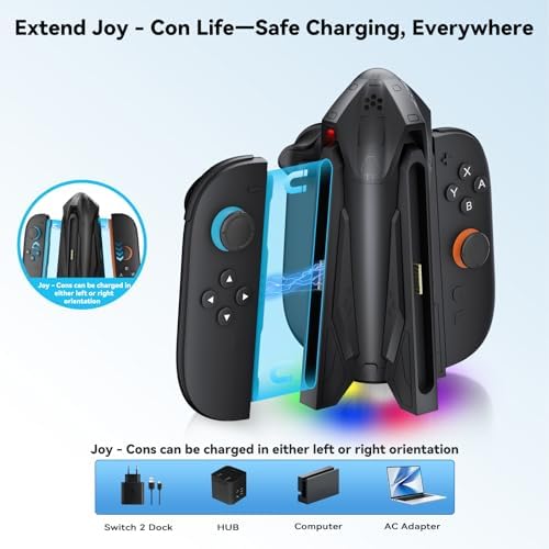[Charge up to 4 Units Simultaneously & Storage Function] This charging station for Joy-Con Switch 2 can quickly charge up to 2 sets of left and right Joy-Cons (4 controllers) simultaneously. The 4 LED indicators on the top clearly show the charging status of each Joy-Con, ensuring you never run out of battery while you play. Our Joy-Con charger also features a convenient storage design, helping to keep your desk neat and organized.