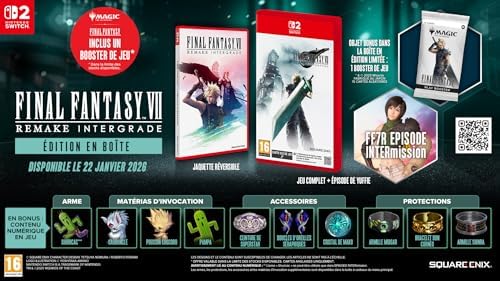 The award-winning FINAL FANTASY VII REMAKE INTERGRADE* game is a reinvention of the original story, right up to Midgar’s escape, accompanied by stunning graphics, thrilling gameplay, and new storyline elements. In addition to an unforgettable story and endearing characters, this RPG features a hybrid combat system mixing real-time action and command-driven strategy. It also includes FF7R EPISODE INTERmission, an ancillary story following Yuffie Kisaragi’s adventures in parallel with those of Cloud. ■ HISTORY Mako, the blood of the planet, is a highly coveted source of energy. Shinra exploits, draws and refines this gasoline to power its reactors, gaining power to control almost the entire world. But resistance is rumbling. A band of motley idealists, Avalanche, are determined to protect the planet. In the town of Midgar, Cloud Strife, a former SOLDIER member turned mercenary, joins Avalanche on a mission to blow up reactor No. 1. The echo of the blast resonates in Sector 8 and the city falls prey to flames. When the sworn enemy he thought was dead appears in the heart of the fire, Cloud must question his memories and identity. A story that will change the destiny of the world begins again. *This game is a partial remake of FINAL FANTASY VII, released in 1997. This is the first installment in a series of games based on the original opus. He reinvents the part of the story set in Midgar, with longer scenes, new characters, and a richer storyline. ■ FF7R EPISODE INTERmission Play as Yuffie Kisaragi, a young shinobi from Wutai, infiltrated in Midgar to carry out a mission to steal the « ultimate materia » from the Shinra. » Key Features: SPARKLING GRAPHICS Explore Midgar like you’ve never seen it before, with stunning graphics bringing the city’s industrial districts to life in all their complexity, while staying true to the original game. DYNAMIC AND STRATEGIC FIGHTS An atypical combat system combining strategic command-driven gameplay and intense action. Change characters continuously, manipulate the power of materials, summon powerful creatures and unleash Transcendence techniques. Emblematic Characters, Unforgettable Story Immerse yourself in the story of Cloud Strife, a former soldier-turned-mercenary allied with Avalanche to confront the sinister Shinra Company. Cloud, Barret, Tifa and Aerith are drawn into a conflict that will determine the fate of the planet. MORE FINAL CONTENT FANTASY VII REMAKE INTERGRADE offers quests, mini-games and missions set in extended areas of Midgar. Meet new characters and experience thrilling content that enriches the story. ENJOYING ORIGINAL BAND This epic soundtrack has been completely remastered, with new arrangements and orchestrations echoing the action to deliver an immersive and moving music experience. ■ Contents included in this product*FINAL FANTASY VII REMAKE INTERGRADE includes the following content: – FINAL FANTASY VII REMAKE Full Game – FF7R EPISODE INTERmission (Yuffie Kisaragi Episode) – Bonus Weapon: Shuricac – Protection: Midgar Armille – Protection: Shinra Armor – Protection: Don Bracelet Corneo – Accessory : Superstar Belt – Accessory: Mako Crystal – Accessory: Seraphic Earrings – Summon Material: Carbuncle – Summon Material: Chocobo Chick – Summon Material: Pampa *Weapons, protections, accessories and summoning materials are available in the gift box of the main menu. *The « Shuricac » weapon can only be used in FF7R EPISODE INTERmission (Yuffie’s episode)