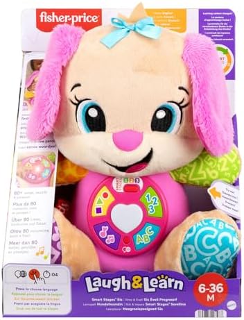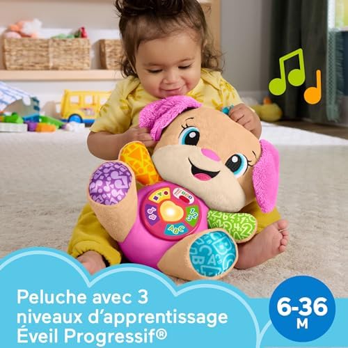 Sis Éveil Progressif Rires et Éveil de Fisher-Price est une peluche musicale toute douce qui initie bébé à l’alphabet, aux formes, aux premiers mots et plus encore , Les tout-petits peuvent appuyer sur les 5 boutons du ventre de Sis pour voir son cœur s’illuminer de différentes couleurs et entendre plus de 80 chansons, sons et phrases. Avec plus de 12 chansons originales et 3 niveaux d’apprentissage Éveil Progressif pour faire évoluer le contenu éducatif à mesure que bébé grandit, Sis Éveil Progressif va sans doute devenir la meilleure amie de votre enfant , Fonctionne avec 3 piles AA (fournies). Appuyez sur le bouton en forme de globe pour choisir la langue : français, anglais, allemand, italien ou néerlandais. Les couleurs et les décorations peuvent varier.