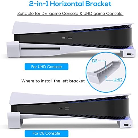 Easy Installation: No screws or tools required, the sliding design holds the console securely on both sides, provides a safer stand than the original stand; For PS5 Disc version, install the console at the bottom of the left bracket, and for the PS5 Digital Edition version, install the console at the top of the left bracket