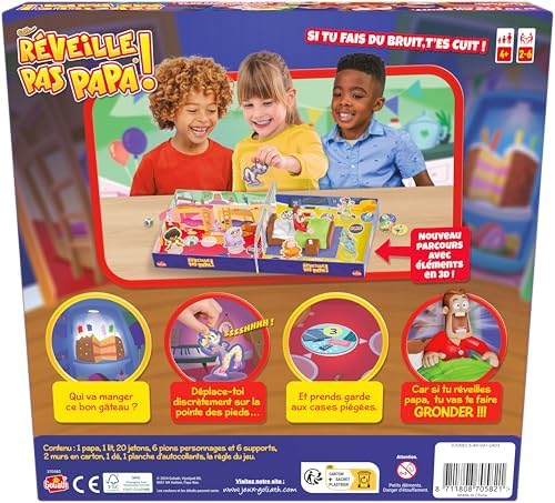 DÉVELOPPE LA MOTRICITÉ : ce jeu de société demande de la dextérité et de la motricité fine pour éviter de réveiller Papa endormi. Qui va manger ce bon gâteau ? Déplace-toi discrètement sur la pointe des pieds et prends garde aux cases piégées. Car si tu réveilles papa, tu vas te faire gronder !!!