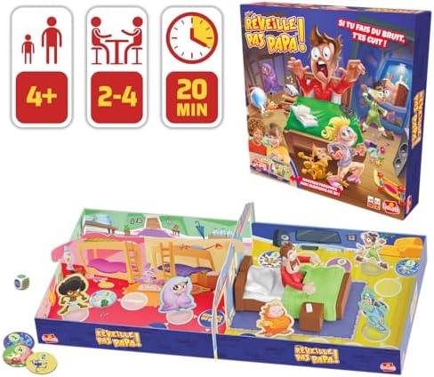 Réveille Pas Papa! est un jeu de société divertissant qui promet des moments de rires et de suspense aux enfants dès 5 ans. Le concept est simple : il s’agit d’éviter de réveiller Papa qui dort profondément dans son lit. Les joueurs doivent faire preuve de concentration et de réflexion pour avancer sur le plateau de jeu et accomplir différentes actions sans faire de bruit. Ce jeu ludique stimule également la motricité fine des enfants, car ils devront faire preuve de dextérité pour accomplir certaines tâches sans provoquer le moindre bruit. Avec ses règles simples et faciles à comprendre, Réveille Pas Papa! est un jeu adapté aux enfants à partir de 5 ans. Ils pourront jouer en toute autonomie ou avec l’aide des adultes pour des moments de complicité en famille ou entre amis. Au-delà du divertissement, Réveille Pas Papa! offre un apprentissage par le jeu. Les enfants développent leur patience, leur logique et leur capacité à anticiper les mouvements, tout en s’amusant. Réveille Pas Papa! est le jeu parfait pour des soirées animées en famille ou entre amis. Les parties sont courtes et captivantes, garantissant des moments de franche rigolade et de suspense à chaque tour. Offrez à vos enfants des heures de jeu joyeux et éducatif avec Réveille Pas Papa! Un jeu de société qui allie amusement, développement des compétences et rires partagés.