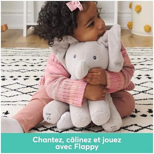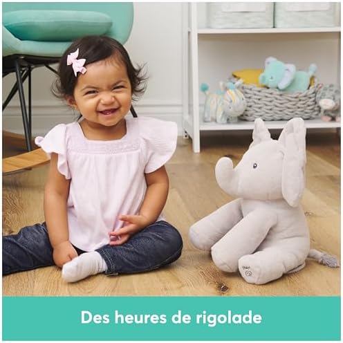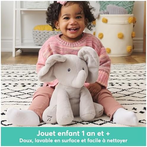 La peluche interactive Flappy l’éléphant est le nouveau meilleur ami tout doux de votre bébé ! Cet adorable éléphant offre des heures de jeu et éveillera votre enfant grâce à ses deux modes de jeu. Appuyez sur le pied droit et Flappy se mettra à chanter et à danser avec bébé. En appuyant sur le pied gauche c’est une partie de cache-cache qui débutera avec Flappy et ses grandes oreilles. Les bébés adoreront sa jolie voix et ses séances de cache-cache ! Attendez-vous à entendre les éclats de rire de votre petit bout de chou. Ce jouet de la marque Gund est de grande qualité et très agréable à prendre en main pour votre enfant. Les tout-petits auront une envie irrésistible de le câliner, de l’adopter et de l’emmener partout avec eux. Flappy constitue un cadeau parfait pour les bébés. L’adorable peluche Flappy l’éléphant est lavable en surface pour un nettoyage sans tracas qui reste doux même après d’innombrables baisers et jeux de cache-cache. Taille : 30 cm de hauteur. Fonctionne avec 3 piles LR06/AA fournies. A partir de 10 mois.
