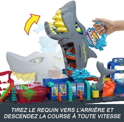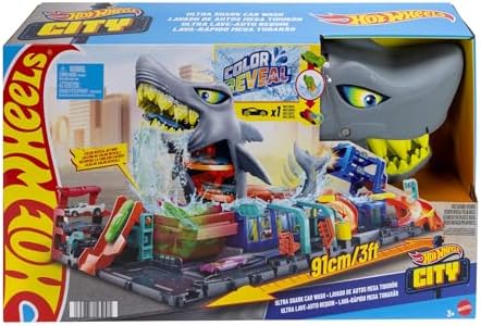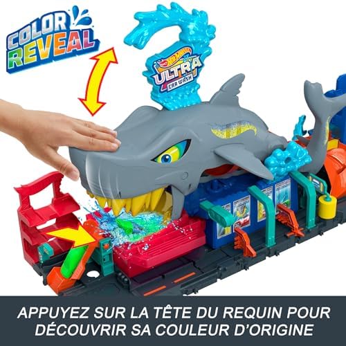 Comme dans la série Netflix « Let’s Race », la Station de Lavage Hot Wheels City a subi l’assaut d’un énorme requin prêt à en découdre ! Les enfants conduisent le véhicule Color Reveal inclus sur la rampe et dans la gueule du requin, puis appuient sur la tête du requin pour changer la couleur de l’eau et révéler la décoration de la voiture. Faites un arrêt sur le requin et regardez la voiture foncer à l’intérieur pendant que l’excès d’eau s’écoule. Tapez sur la queue du requin pour lancer les voitures du parking dans le réservoir d’eau glacée et vous laisser surprendre par le changement de couleur. Retrouvez les couleurs initiales de la voiture en repassant dans la station de lavage. Sur la base, les détails des éléments de piste stimulent l’imagination, avec des barrières mobiles et un rouleau qui ressemble à celui d’une vraie station de lavage. Le kit se plie en deux pour faciliter le rangement. Une poignée aide à le transporter et à vider l’excès d’eau. Un véhicule Hot Wheels Color Reveal est inclus. Les couleurs et les décorations peuvent varier.