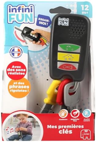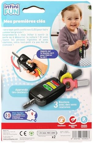 3 clefs aux formes et aux couleurs différentes pour plus de découverte. Lorsque bébé appuie sur le bouton vert, la clé se déploie, une lumière rouge apparait et un effet sonore réaliste retentit. Il entend également des phrases amusantes en appuyant sur les boutons ou encore le nom des couleurs.