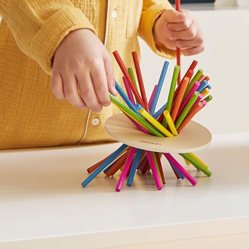La tension sera vite à son comble avec ce jeu d’adresse tout en bois ! Pour gagner, il faudra faire preuve de sang-froid et défier ses adversaires en retirant un maximum de bâtons colorés !