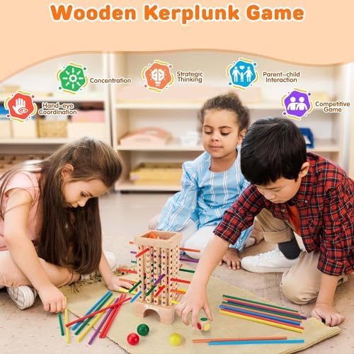 Jeu Kerplunk Amélioré pour 1 à 6 Joueurs: Le jeu de société peut accueillir jusqu’à 6 joueurs. Le jouet Montessori est un modèle de simulation de la tour penchée de Pise en Italie. Le jouet d’activité est le même que le KerPlunk classique. Améliore la version originale en bois, rendant le bâton moins susceptible de glisser, et ajoute des bâtons et des balles colorés pour augmenter le plaisir du produit.