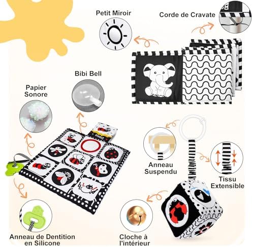 🤍【Sûr & Inoffensif】Le livre en tissu à double face et le hochet suspendu sont fabriqués en coton de haute qualité qui est souple et résistant à la déchirure. Le tapis à froisser est en tissus 100 % sûrs et non toxiques. Les cartes noires et blanches ont une surface mate qui ne reflète pas la lumière et n’abîme pas les yeux de votre bébé. Les anneaux de dentition en silicone sont plus faciles à stériliser.