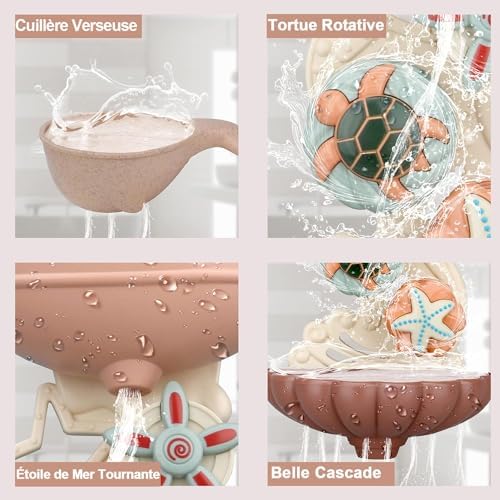 L’eau coule de la sortie et arrose les roues rotatives, les faisant tourner et captant l’attention des enfants. Les adorables tortues et la forme d’étoile de mer plaisent beaucoup aux enfants.