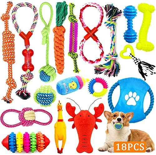 Ensemble de 18 jouets de jeu interactifs Noeud de corde à mâcher, boule de corde, jouet de disque volant, jouet populaire de couinement de poulet hurlant, ces jouets de corde colorés peuvent facilement éveiller l’intérêt du chien et réduire la solitude et l’ ennui. Sûr et de haute qualité Fabriqué en caoutchouc naturel, coton et nylon, l’ensemble de jouets pour chien satisfait l’instinct naturel de mastication de votre chien. Il est écologique, durable et sans danger pour la santé de votre chien. Prendre soin de la santé dentaire de votre animal de compagnie Les meilleures fibres de corde de jouet pour chiot permettent aux chiens de passer la soie dentaire tout en mâchant et en jouant, ce qui peut prévenir la maladie des dents. Pendant la période de mastication de l’animal, l’utilisation du jouet à mâcher nettoiera les dents de l’animal et la prévention des taches et réduira le tartre. Durable et lavable Avec une résistance aux morsures, le jouet à nœud en corde robuste peut durer longtemps. Et ces jouets réutilisables pour chiens peuvent être lavés en machine.