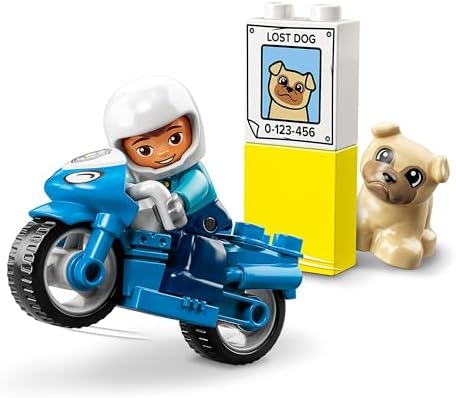 LEGO DUPLO La moto de police (10967), un jouet pour les enfants en bas âge et les enfants en maternelle âgés de 2 ans et plus, il offre un jeu de développement pratique qui ravira tout enfant intéressé par le travail de la police, les jouets de moto de police et le soin des animaux. Un chien a disparu ! Vous trouverez une affiche « Chien perdu » qui vous permettra de le retrouver à coller accompagnée d’une mission passionnante à accomplir. Avec 2 figurines LEGO DUPLO – un animal mignon dont il faut s’occuper et un policier sur une moto de police, ce jouet polyvalent pour les 2 ans aidera les enfants à développer leurs compétences sociales, émotionnelles et leur motricité fine en jouant les aventures réelles d’un héros de tous les jours. Tous les ensembles LEGO DUPLO sont conçus de manière experte avec des récits engageants, des couleurs captivantes, des personnages divers et des détails fascinants pour donner à votre enfant un grand départ dans la vie.