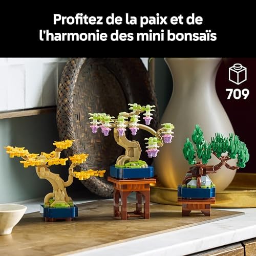 Become one with nature with this LEGO Botanicals Mini Bonsai (10373) adult building set, which offers an enjoyable project for plant lovers. Relax as you build 3 majestic bonsai trees: a ginkgo with golden leaves, a black pine with green needles, and a wisteria adorned with hanging lilac flowers. Each mini bonsai tree features interchangeable foliage allowing you to express your creativity by customizing your trees and swapping their leaves. The set also includes 2 stands that offer the possibility of displaying bonsai trees at different heights and from various angles, making these creations stunning interior decoration elements. Beautiful gift for a housewarming or birthday to a woman or man who is passionate about plants, these 3 LEGO plants will bring a touch of serenity to any space. DIMENSIONS – The wisteria in this set measures over 19cm high, 14cm wide and 10cm deep. The set contains 709 pieces.