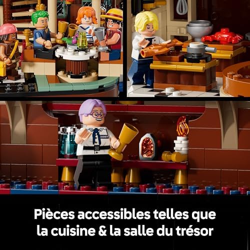 Intérieur détaillé et accessible – Ce modèle décoratif en forme de navire renferme de nombreuses pièces, dont une cuisine avec un mur rabattable pour accéder aux autres ustensils, une salle à manger, les quartiers de Zeff et la salle du trésor