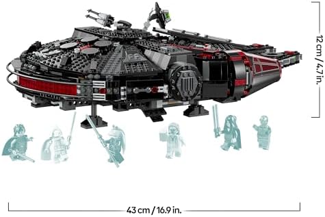Transform the LEGO Star Wars universe with The Buildable Black Falcon (75389), which includes a dark version of the Millennium Falcon, inspired by the Disney+ LEGO Star Wars: Rebuilding the Galaxy series. This Star Wars toy is a great birthday gift idea for a child from 10 years old. This brick LEGO Star Wars spacecraft features panels that rise up to access the detailed interior, where the throne of Dark Jar Jar Binks, command center, hyperdrive, entertainment room and prison cell are located. Spring rifles, rotating barrels and a removable shooter station multiply the possibilities of play. The ship also contains 6 never-before-seen LEGO Star Wars minifigures including Dark Jar Jar Binks, Luke in Beach Mode, and Jedi Vader. This Star Wars ship model can be paired with the 75388 Jedi Bob’s Star Hunter and 75393 TIE Fighter and X-Wing Combine sets (sold separately), which include vehicles and characters from the LEGO Star Wars: Rebuild the Galaxy series. Measures over 12cm high, 43cm long and 32cm wide and contains 1,579 pieces. The set measures over 12cm high, 43cm long and 32cm wide. Contains 1579 pieces.