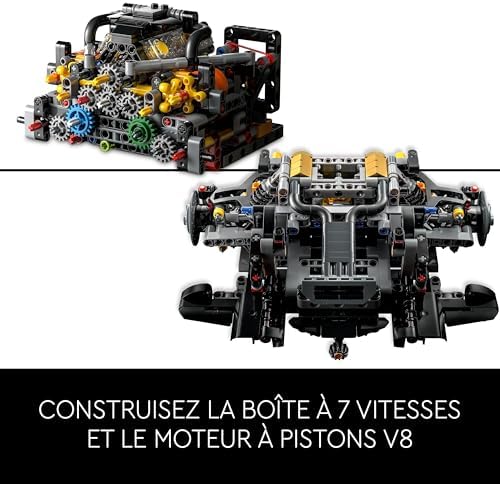 Build the V8 Piston Engine and More – Dive into building all the details of this LEGO model, including the 7-speed gearbox with selector drum, opening doors, adjustable rear spoiler and V8 piston engine