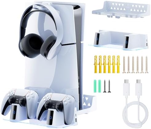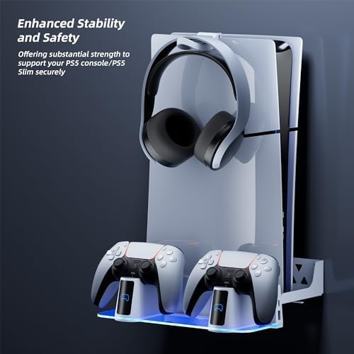 Fast Charging & Convenient LED Indicators The innovative PS5 wall mount seamlessly integrates storage and charging capabilities into one stylish unit. Not only does it serve as a secure storage space for your PS5/PS5 Slim console, it also makes it easy to charge your PS5/Edge controller. It only takes 2.5 hours to fully charge two PS5 controllers. Switches from blue to blue while charging and from orange to blue when fully charged