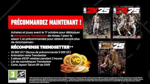 Buy, download and play before October 17 to win the Trendsetter* reward for Season 1, Level 1. This gift includes 15,000 VC and other My CAREER and MyTEAM bonus content! *For conditions and how to recover the Trendsetter Reward, please visit https://nba.2k.com/2k25/faq/ – Pre-order NBA 2K25 and receive 5,000 VC (Virtual Currency). Pre-order content available via code in the box (if pre-ordered game) / This edition includes NBA 2K25 for PS5. Disc Content: PS5 Game