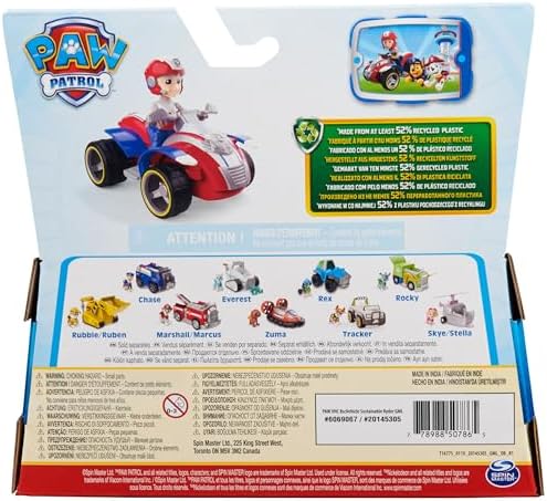 JOUET DURABLE 52% PLASTIQUE RECYCLÉ – Ryder et son véhicule Pat Patrouille sont fabriqués à partir d’au moins 52 % de plastique recyclé ; Recréez chez vous les palpitantes aventures de la série d’animation à succès avec les chiots et leurs véhicules