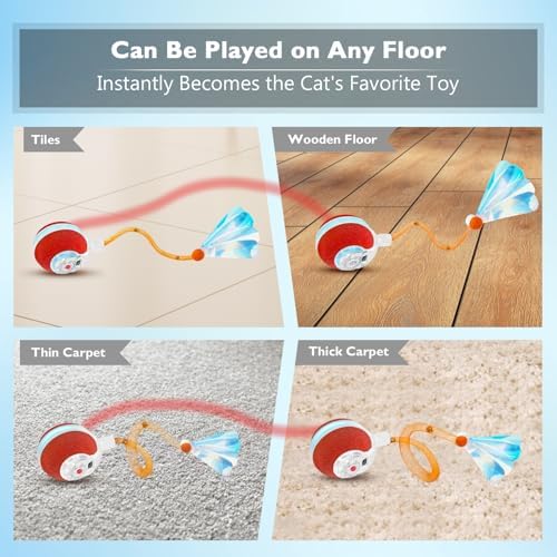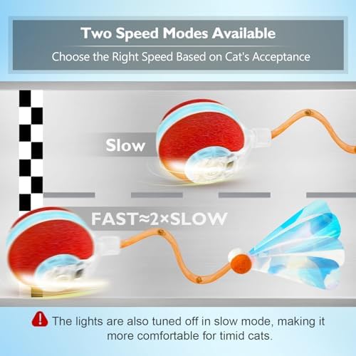 Deux Modes d’Interaction : Maintenez le bouton enfoncé pendant 1 seconde pour activer le mode lent (la lumière rouge clignote puis s’éteint). Il convient aux chats timides, moins actifs ou plus âgés. Nous avons spécifiquement éteint la lumière pour ces chats pour éviter de les effrayer ou de nuire à leurs yeux. Appuyez brièvement à nouveau sur le bouton pour passer au mode rapide (la lumière bleue est allumée en permanence). Ce mode s’applique à toutes les surfaces telles que les tapis et les sols durs et est idéal pour les chats adultes audacieux et énergétiques