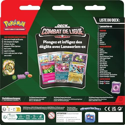 Dive in and put them K.O. with Lanssorien-ex! Consisting of a harmonious set of Pokémon and Trainer cards, this League Combat Deck brings together all the elements you need for your next fight. You will find 1 ready-made deck of 60 cards, 6 damage marker dice, 1 coin throw, 2 Special States markers, 1 deck case, 1 strategy page and 1 code card to play online.