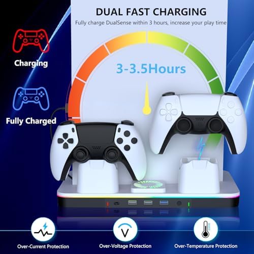 【High Expandability】Includes 3 USB hubs to charge other devices such as mouse, keyboard and headset. Stylish and organized storage for all your PS5 accessories including console, 2 controllers, headphones and media remote