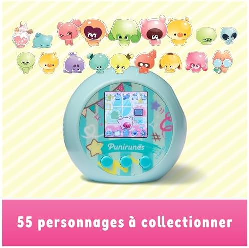 Découvrez les animaux de compagnie numériques Punirunes pour enfants ! Avec ce jouet combinant le plaisir de prendre soin d’animaux numériques et un élément tactile moelleux, construisez votre propre utopie remplie de personnages adorables et super mignons. Placez un doigt à l’intérieur du jouet Punirunes et découvrez un bouton squishy qui répond au toucher. L’écran couleur LED reproduit vos mouvements à l’écran, comme si vous touchiez vraiment le Punirunes. Bougez le bouton et regardez comment le personnage réagit. Développez des amitiés avec vos amis digitaux interactifs et rendez-les heureux avec beaucoup de caresses, préparez leur à manger, donnez-leur un bain, nettoyez leur chambre, jouez à des jeux et bien plus encore. En jouant, vous gagnerez des graines pour cuisiner, créer des accessoires et aider vos Punirunes à grandir et passer de bébé à enfant puis à adulte. Dépensez des pièces au marché pour personnaliser les personnages avec des nœuds papillon, des chapeaux, des couronnes de fleurs et bien plus encore, changer la couleur de votre ami et décorer sa chambre. Explorez leur monde et collectionnez les 55 personnages. Le boîtier de taille compacte est portable pour pouvoir l’emporter partout où vous allez. Plongez dans le monde de Punirunes !
