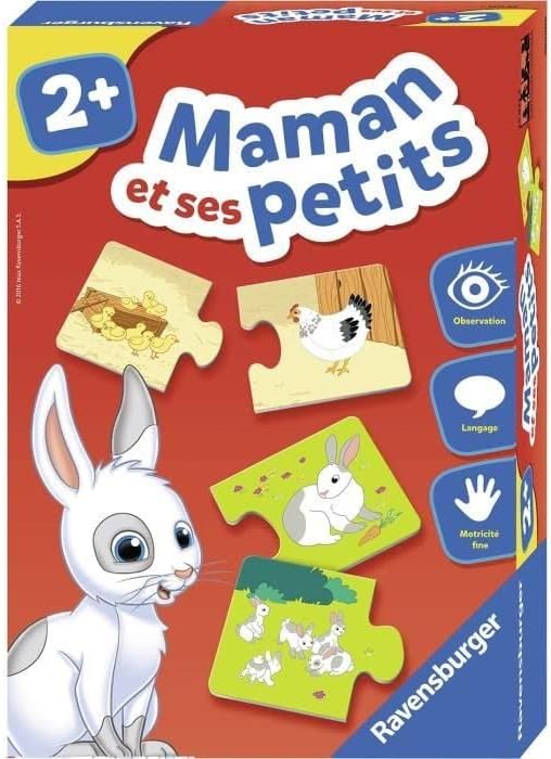 Les enfants sont particulièrement fascinés par les animaux. Le jeu « Maman et ses petits » leur propose de découvrir les animaux dans leur environnement et d’apprendre leur nom. Dans cet univers de jeu très tendre, il faut retrouver les petits de 12 mamans. Grâce aux pièces de puzzle autocorrectives, l’enfant joue à réunir les familles en toute simplicité et peut vérifier lui-même s’il a correctement associé les images. Les cartes extra épaisses lui offrent un confort de jeu optimal pour jouer et rejouer, encore et encore !Ce jeu favorise ainsi le sens de l’observation, le développement du langage, du vocabulaire lié aux animaux, et de la motricité fine. A partir de 2 ans