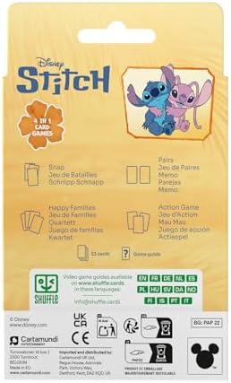 Plongez dans l’univers coloré et espiègle de Stitch avec le Jeu 4 en 1 Stitch ! Ce jeu de cartes Disney incontournable propose 4 jeux différents dans un seul jeu de cartes : le classique jeu de 7 familles, un jeu de bataille, un jeu d’action et un jeu de mémoire. Parfait pour des moments de plaisir en famille ou entre amis, ce jeu est conçu pour les enfants dès 4 ans et peut se jouer à partir de 2 joueurs. Laissez-vous emporter par l’aventure hawaïenne de Stitch, Lilo et leurs amis dans un cadre tropical et intergalactique. Grâce à des illustrations fidèles à la licence Disney, vous retrouverez tous les personnages emblématiques de l’univers de Stitch. Chaque famille du jeu de 7 familles représente un aspect unique de cet univers : ohana, aventures galactiques, moments hawaïens et bien d’autres. Un excellent moyen de découvrir l’univers de Stitch tout en s’amusant ! Ce jeu compact et facile à transporter vous permettra de partager des instants conviviaux, que ce soit à la maison ou en déplacement. Stimulez la mémoire et la stratégie des petits et des grands, tout en apprenant les valeurs de l’entraide et de la convivialité. Parfait pour des moments de complicité autour d’un classique revisité avec un personnage adoré par les petits et les grands.