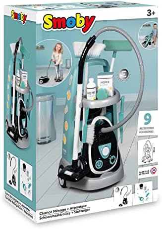 Chariot ménage avec 9 accessoires : balai, balayette, pelle, balai serpillère, seau, éponge, boite, bouteille dont 1 aspirateur (réel bruit d’aspirateur). 3 piles LR44 incluses.