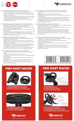 Take control of the family racing with 2 pack Subsonic Pro Kart Racer steering wheels for Switch 2 / Switch compatible joycon. With their exclusive sport design designed for racing games like Mario Kart 8, Mario Kart World… you will easily avoid Bloups, Carapaces, Bananas… scattered on your trajectory to rush on the Bill Balls and win the race hands down!
