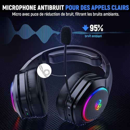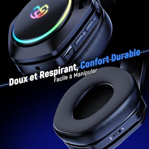 ✨【Extra Long Day Playtime】This wireless gaming headset has a 1000mAh battery providing up to 35 hours of use without lighting, and up to 22 hours with lighting.